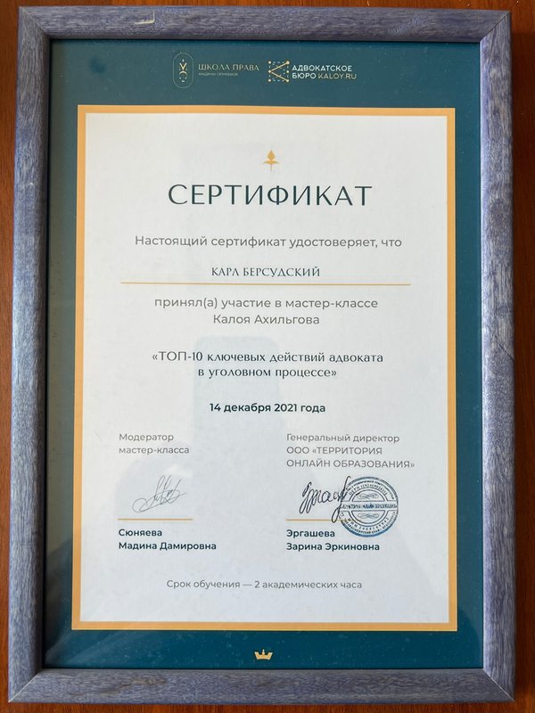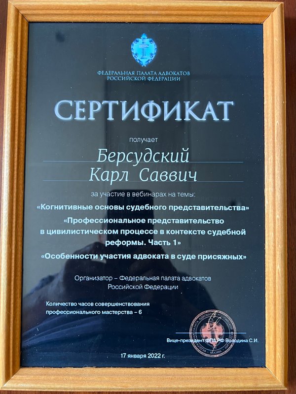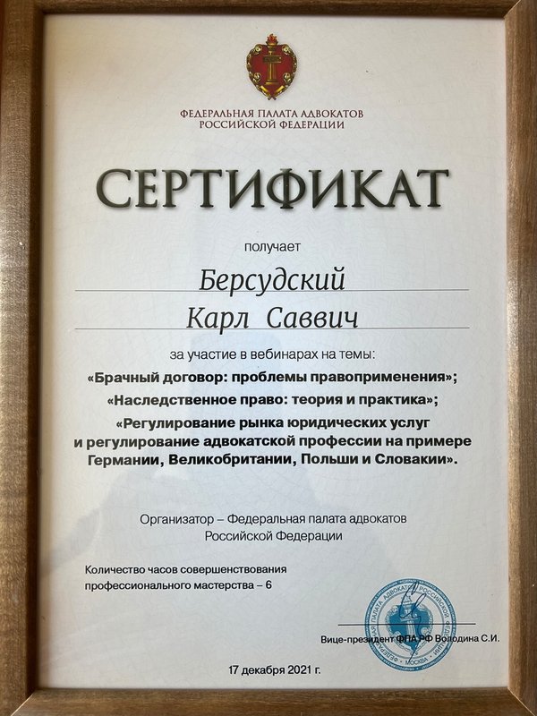 Нельзя знать заранее, когда вам может понадобиться помощь грамотного юриста. Адвокатский кабинет Берсудского К.С. предлагает успешное решение любых споров в досудебном и судебном порядке. Для вас работают опытные юристы - специалисты с многолетним опытом работы - которые смогут ответить на ваши вопросы. Если вы находитесь во Фрунзенском районе, то смело обращайтесь по указанным номерам. Тем, кому необходима такая услуга, как юридическое обслуживание, двери здесь открыты всегда.